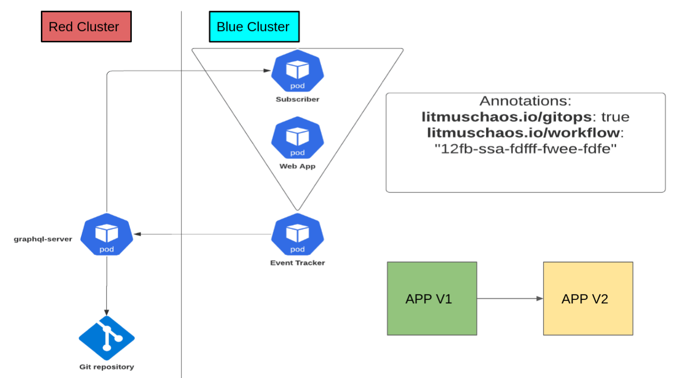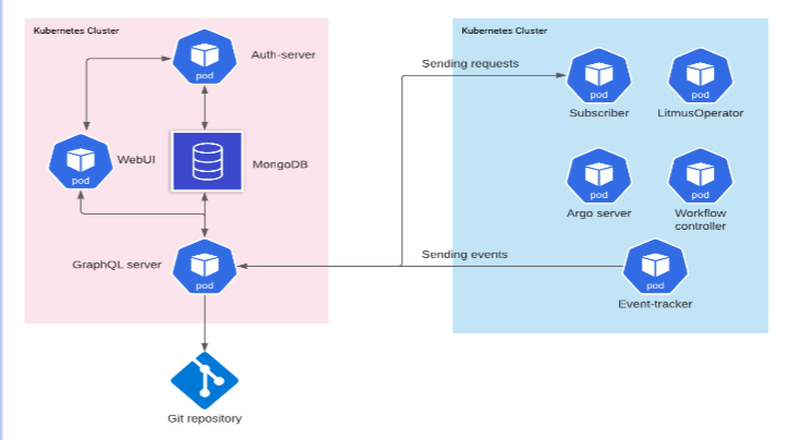 In the above architecture, the Event-tracker pod tracks the Web App continuously, if any change occurs (for eg: The app version changes from V1 to V2), it gets triggered and informs the graphql-server pod, the server will then try to look for the chaos experiment using workflow_id from the git repository. Once it gets the required chaos experiment, it will send it to the subscriber which is responsible for applying the chaos experiment to the target cluster. After the chaos experiment run is completed you can check the resiliency of your application.